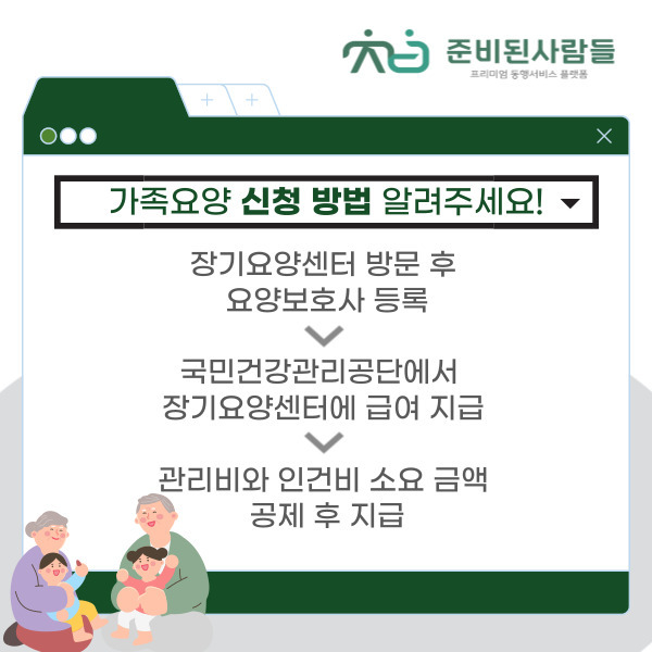 안녕하세요 준비된사람들입니다. 오늘은 가족요양에 대한 장기요양정보를 알아보도록 하겠습니다. Q. 가족요양이란 무엇인가요? 요양이 필요한 어르신께가족관계인 요양보호사가어르신을 모