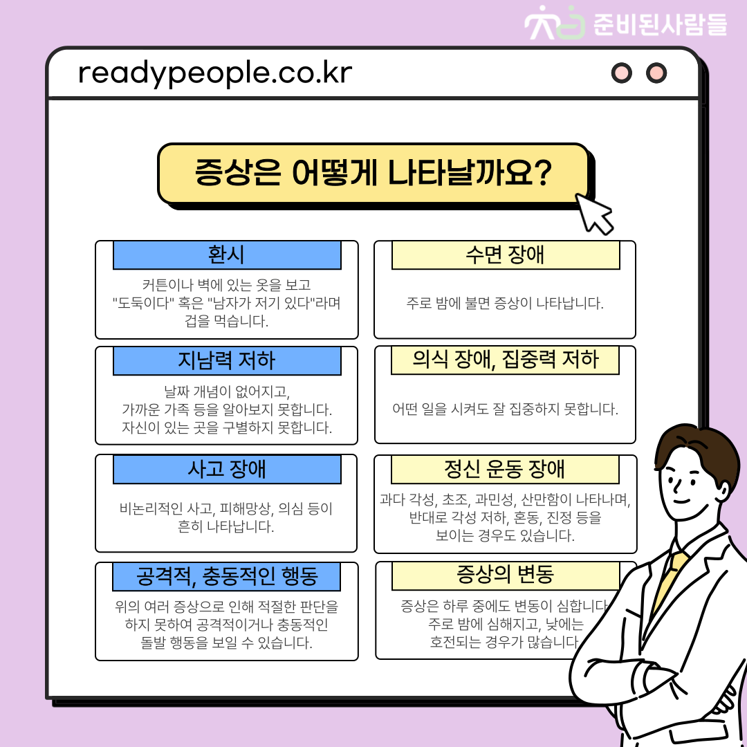 비논리적인 사고, 피해망상, 의심 등이 흔히 나타납니다.