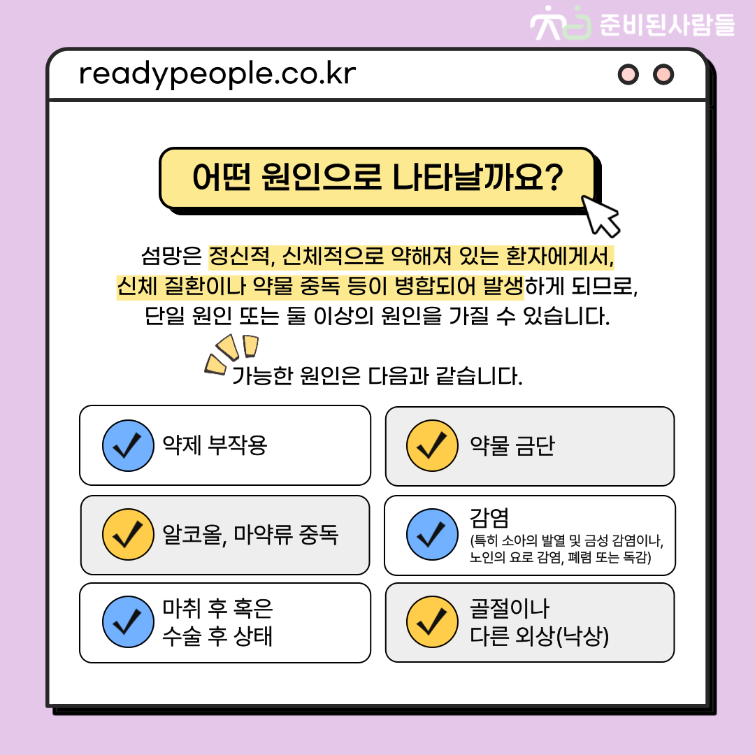먼저, 섬망은 신체 질환이나 약물, 술 등 다양한 원인으로