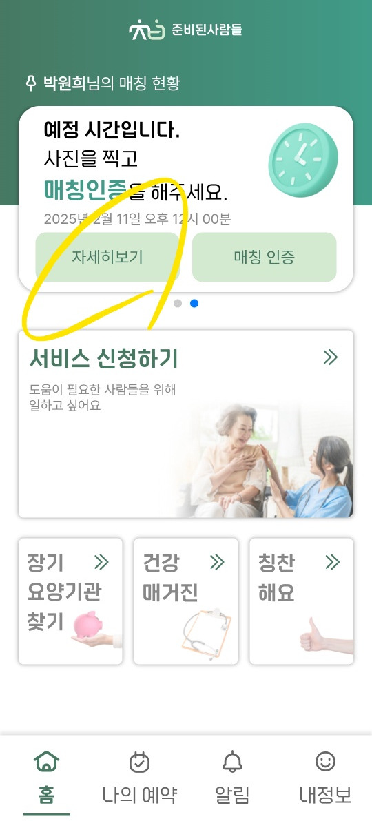 이 중 해당하는 날짜, 어르신을 확인하고 클릭하시면 됩니다.