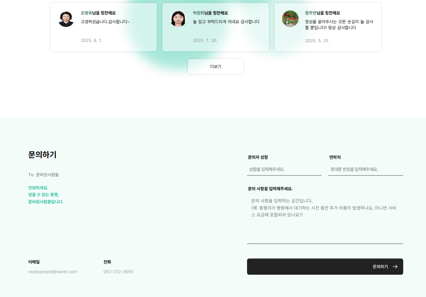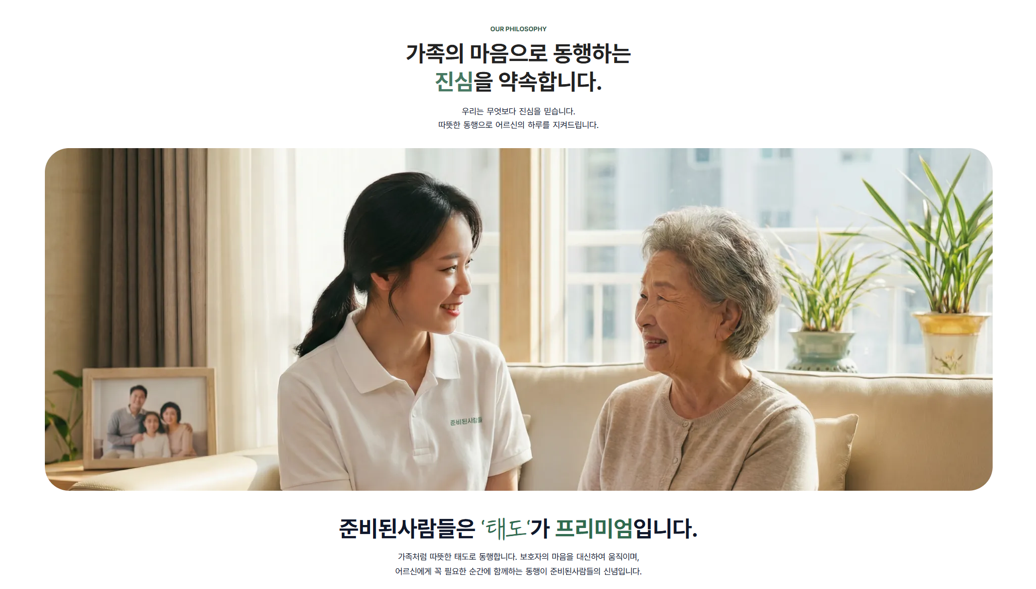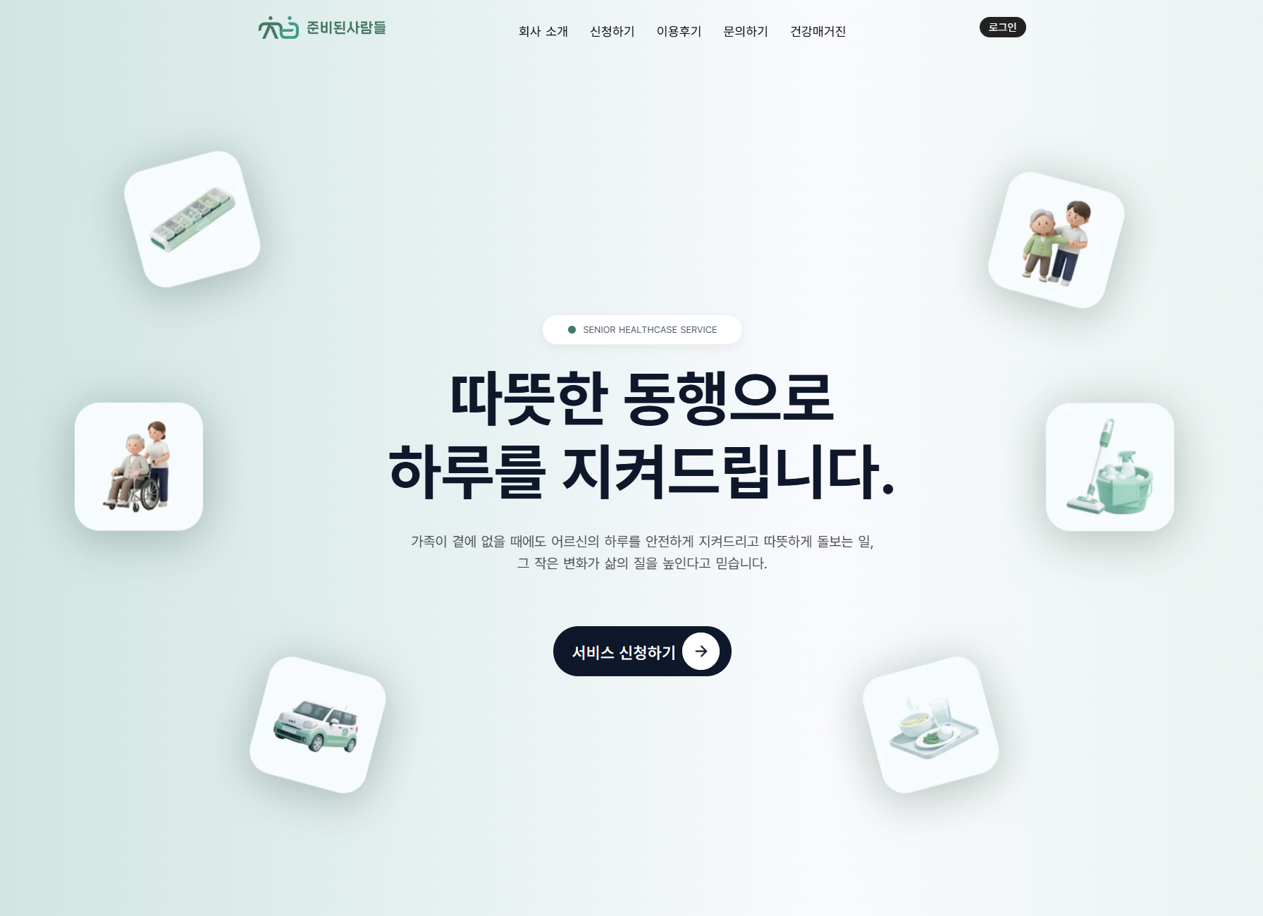 히어로 섹션의 시작은 준비된사람들이 전달하고자 하는 핵심 메시지인 "따뜻한 동행’이라는 문구로 구성했습니다.