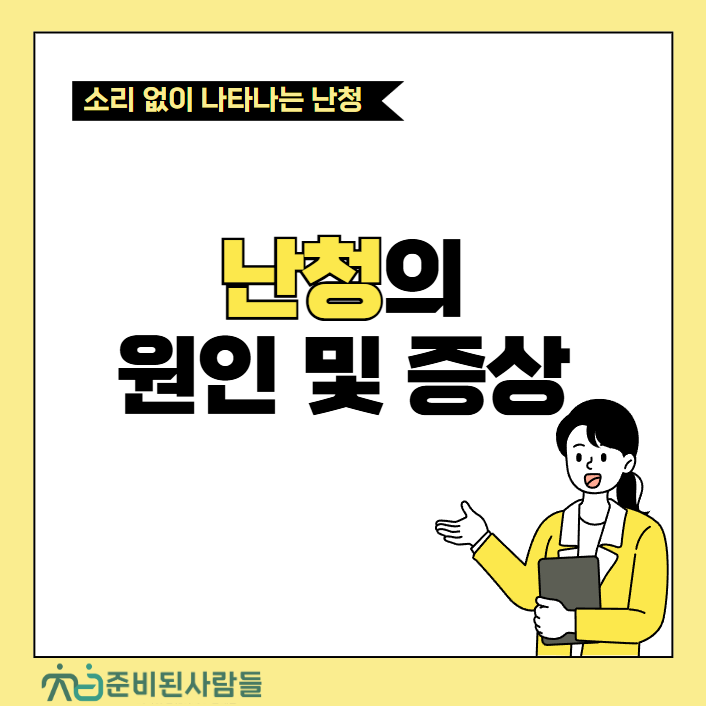 안녕하세요 준비된사람들 입니다.​ 오늘은 귀가 먹먹한 증세로부터 시작되는난청에 대해 알아보도록 하겠습니다.​​ Q. 난청이란 무엇인가요? 귀는 크게외이, 중이, 내이로 구분할 수 있습니다.​외이와 중이는 소리를 모아서 증폭함으로써​소리가 내이까지 잘 전달될 수 있도록 하며, ​내이는 전달받은 소리를 감지 및 분석하여 뇌로 전달하는 역할을 합니다.​난청은 이러한 귀 구조의 일부가 제 역할을 다하지 못하여 ​작은 소리를 듣기 어렵거나,들리는 소리를 구분할 수 없는 상태를 의미합니다. Q. 난청의 증상에는 무엇이 있을까요? 소리가 작게 들리거나 멀게 느껴지게 되고, ​소리의 명료도가 떨어져 말소리가 왜곡되어 들리거나뭉개져 들릴 수 있습니다. 또 주변이 시끄러운 곳이나 사람들이 많은 곳에서 더 알아듣기 힘들어..